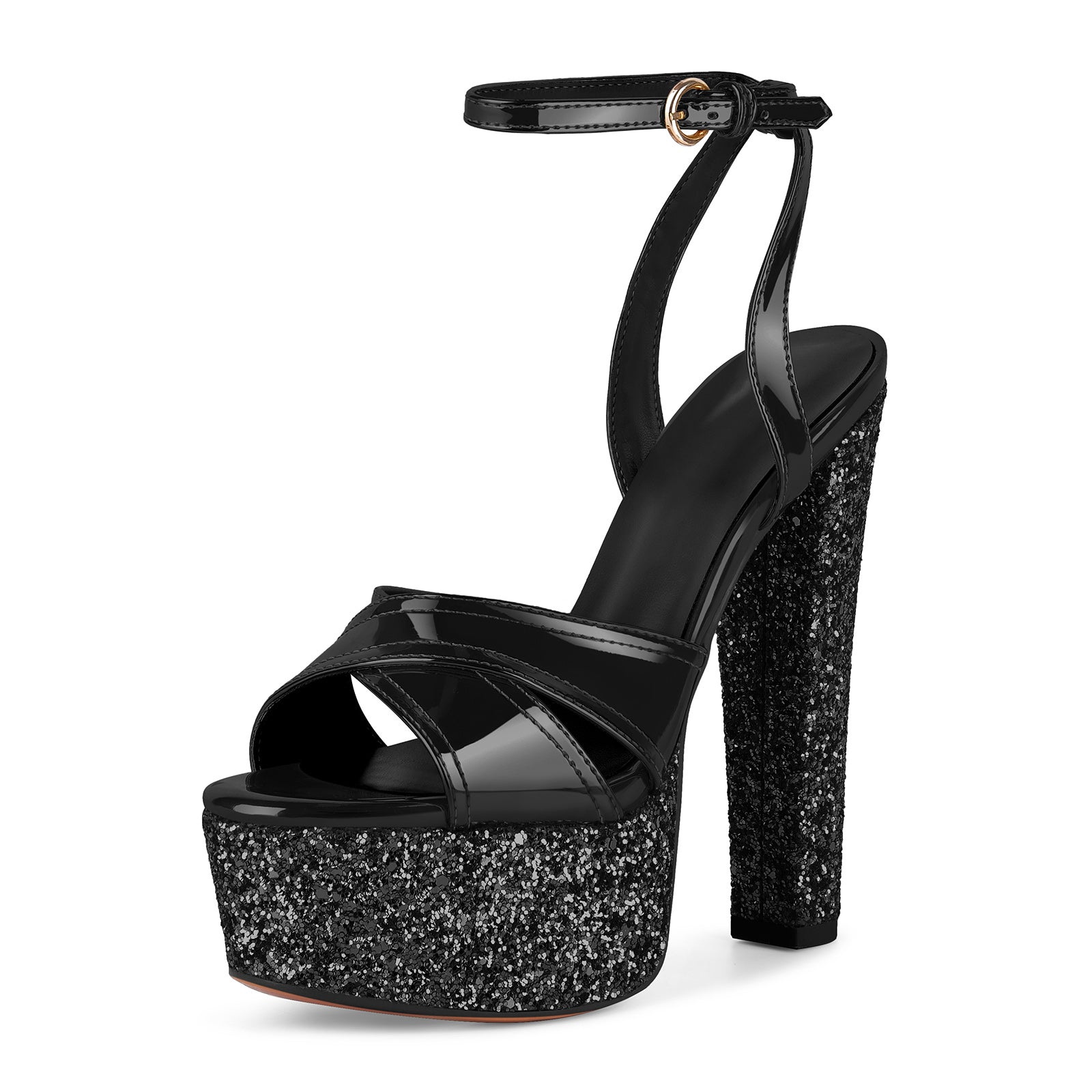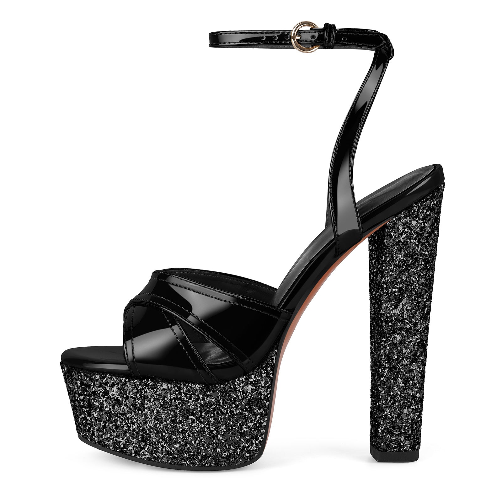 Glitter Platform Ankle Strap Chunky Heel Sandals