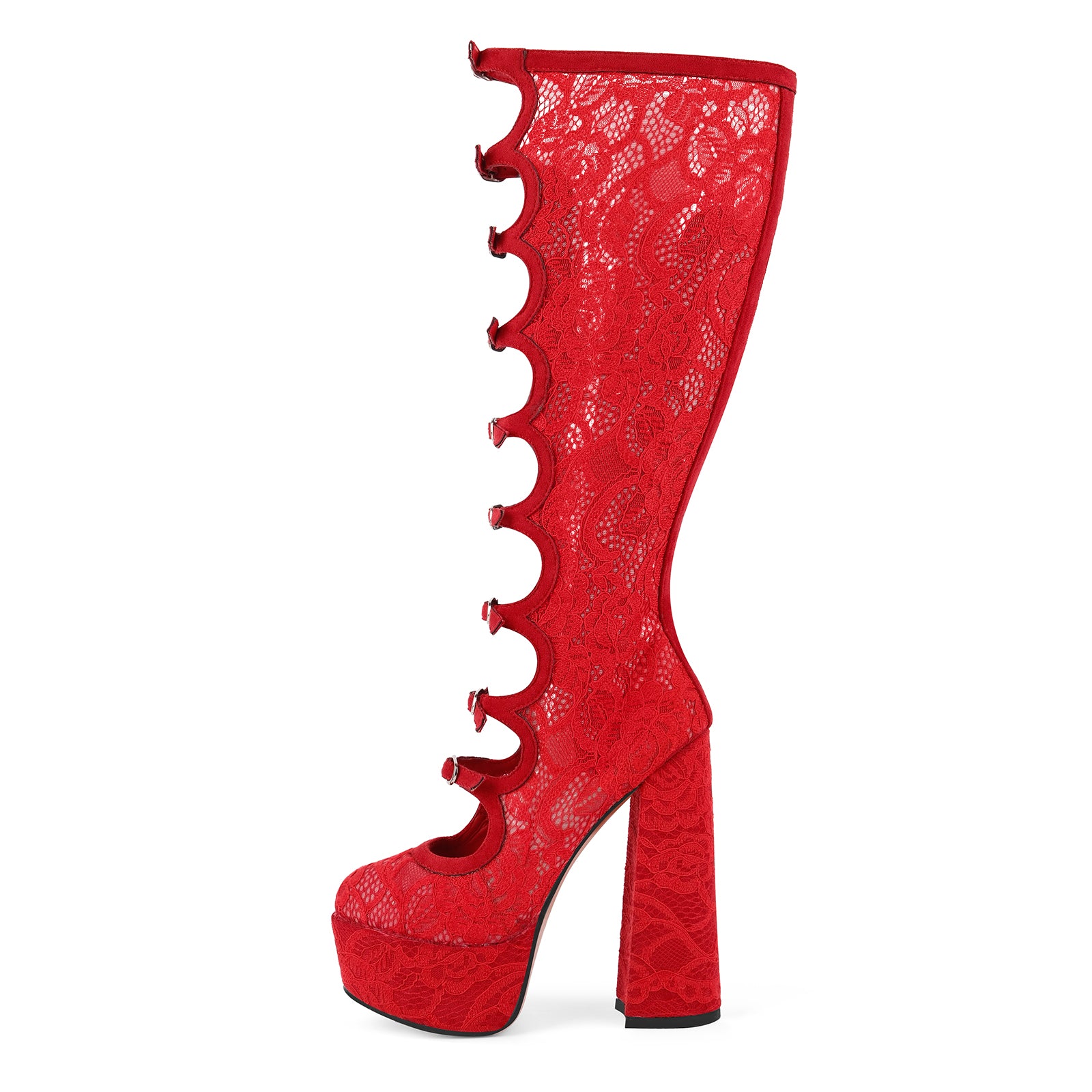 Lace Mesh Multi Buckle Strap Knee High Boots